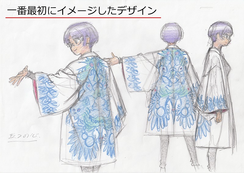 一枚の羽織のデザインを手にするのはプロのアニメーターさん。