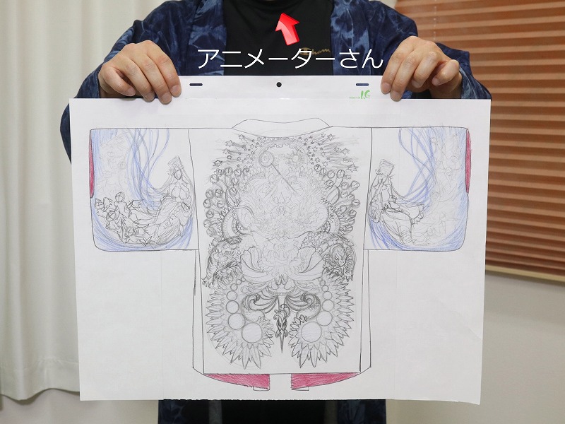 一枚の羽織のデザインを手にするのはプロのアニメーターさん。