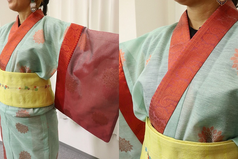 キラキラ模様を衿・袖付・衽・裾に配置して、袖の左右を色違いにしてみようと考えました。