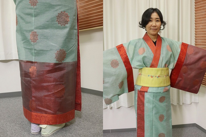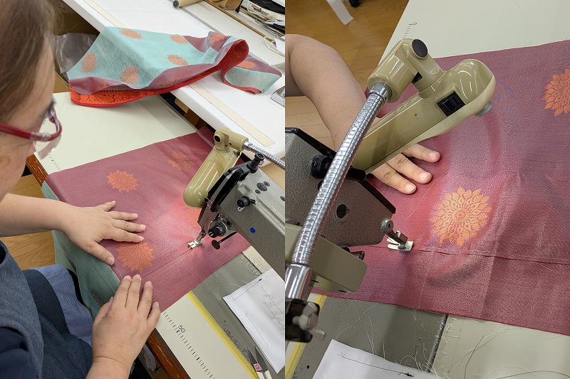 着物用の反物とは違い、薄くて扱いにくい生地だと思いますが、ベテランの手にかかると実に見事!