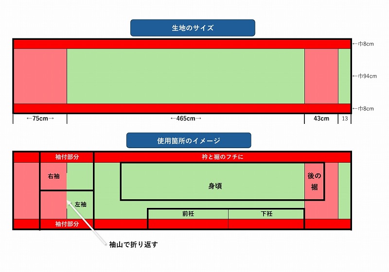 上の図は店主が考えた生地の裁断イメージ。