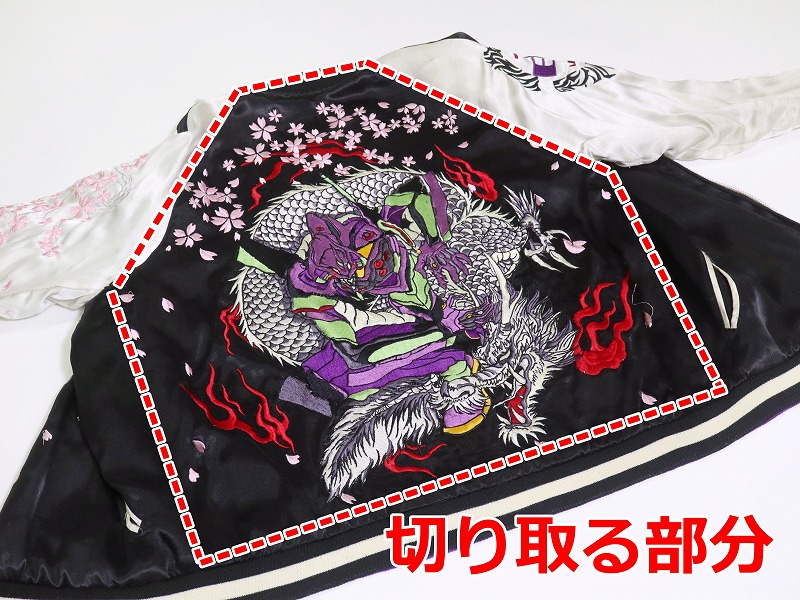 まず 刺繍のベースになっている黒い生地を切り取ります。(点線部分)